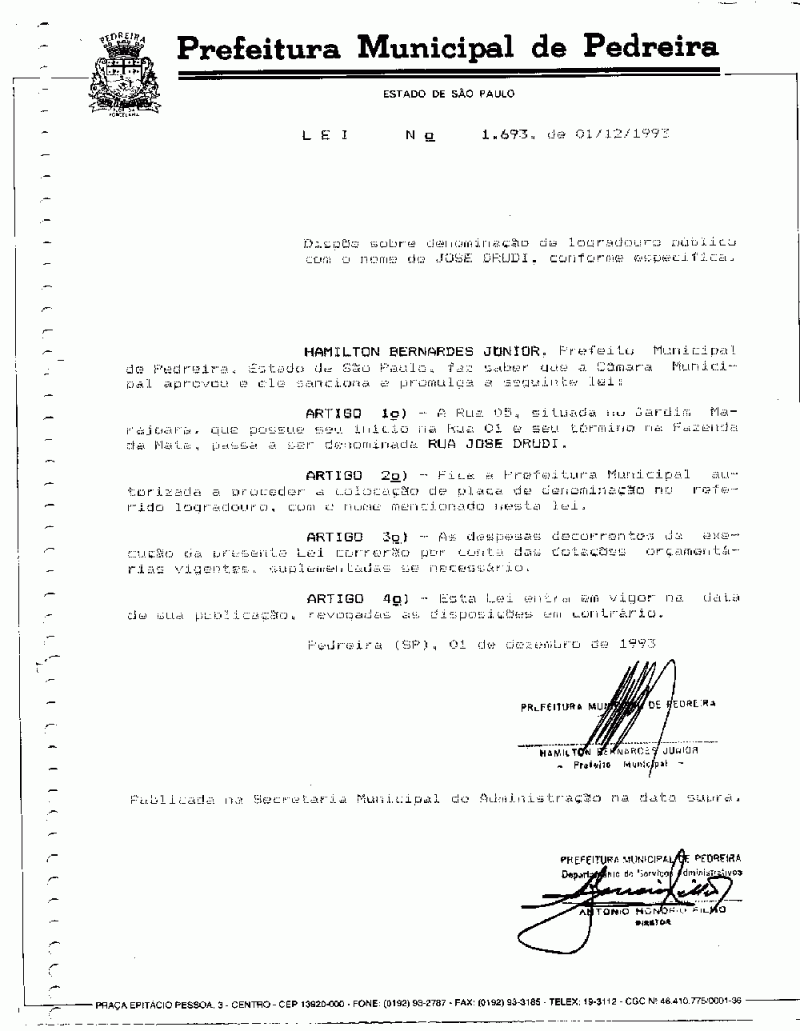 Lei Municipal - N° 1693 de 01/12/1993