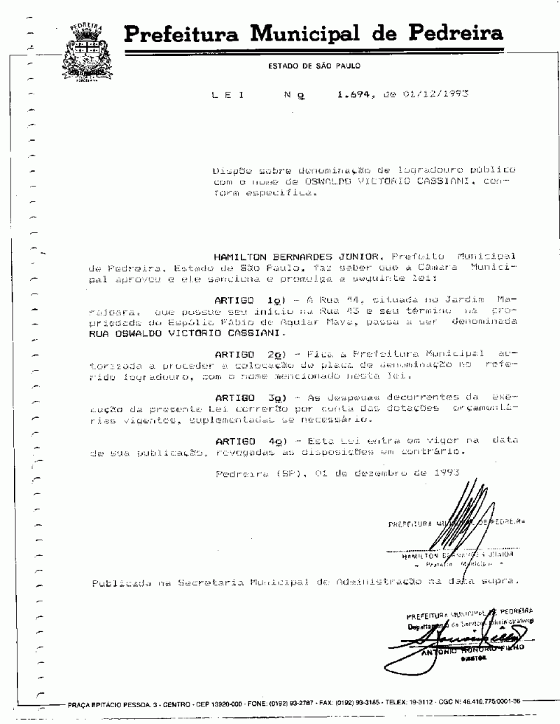 Lei Municipal - N° 1694 de 01/12/1993