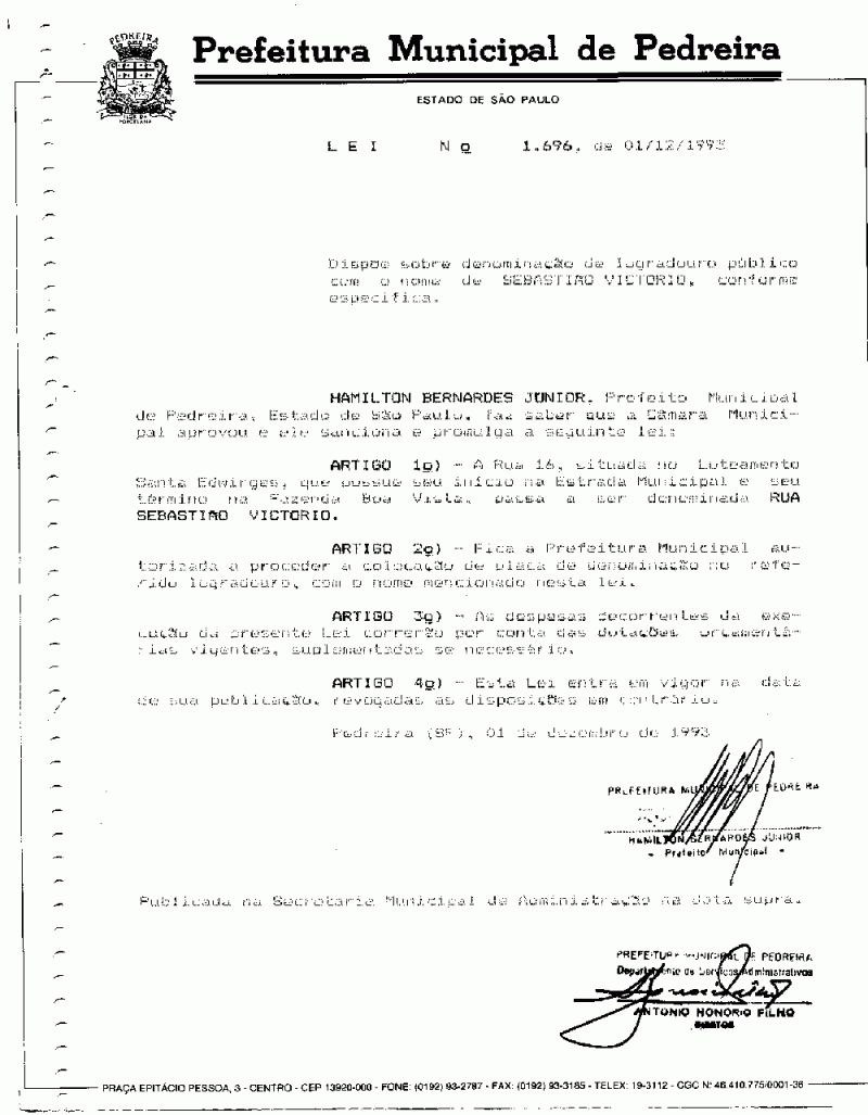 Ementa: Dispõe sobre denominação de logradouro público com o nome de Sebastião Victório, conforme especifica.