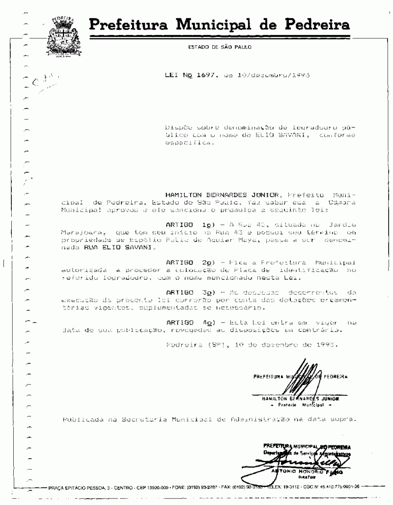Lei Municipal - N° 1697 de 10/12/1993