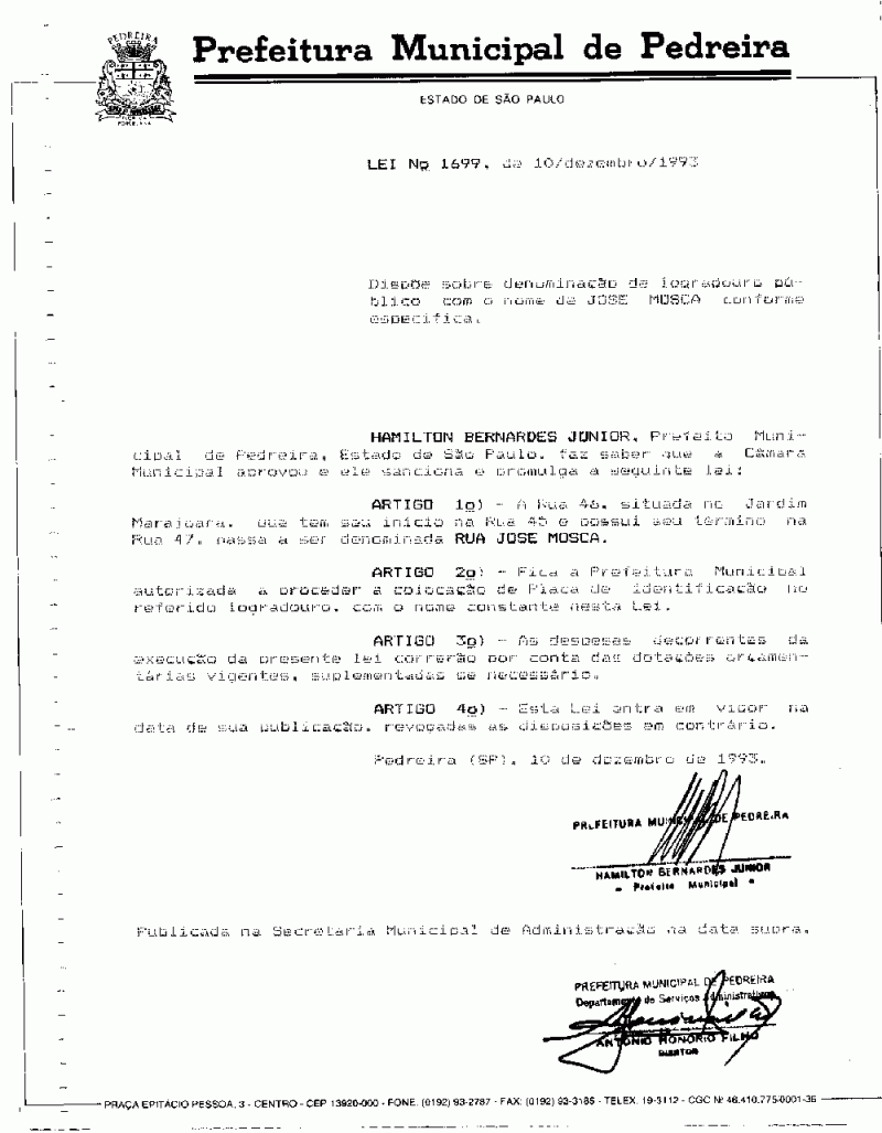 Ementa: Dispõe sobre denominação de logradouro público com o nome de José Mosca conforme especifica.