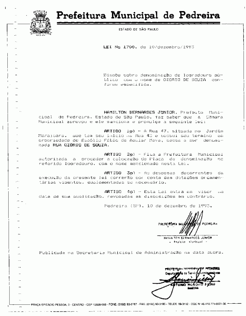 Lei Municipal - N° 1700 de 10/12/1993