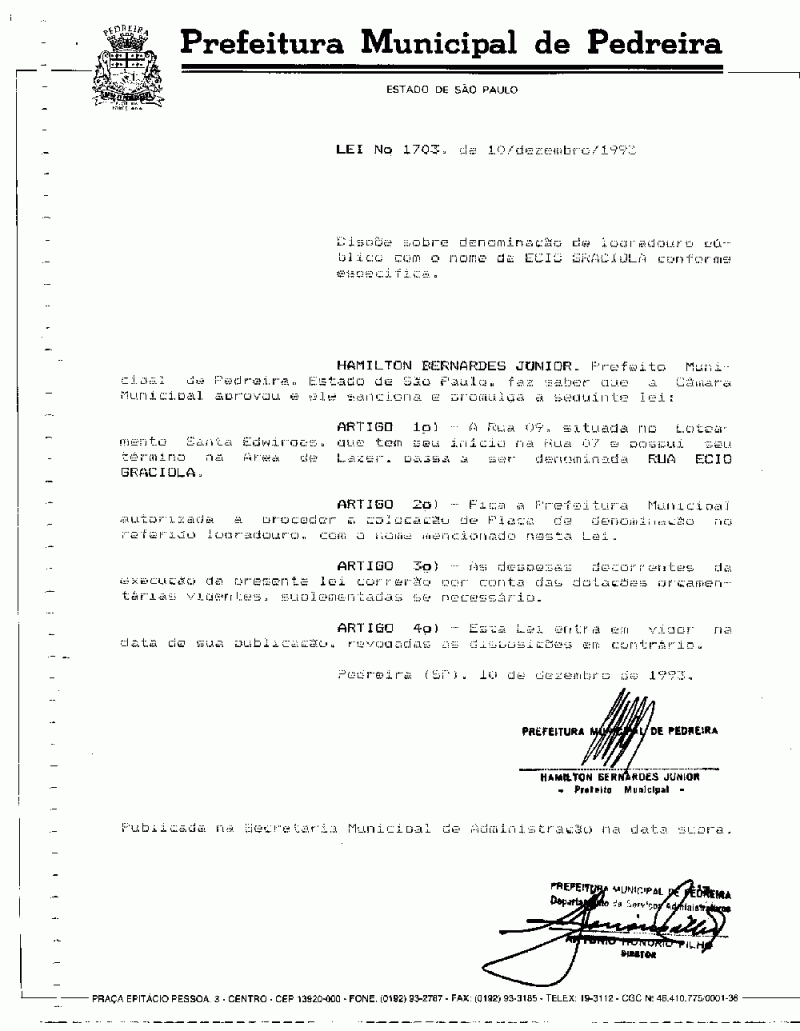 Lei Municipal - N° 1703 de 10/12/1993