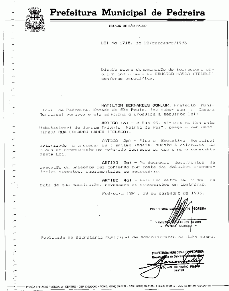 Lei Municipal - N° 1715 de 28/12/1993