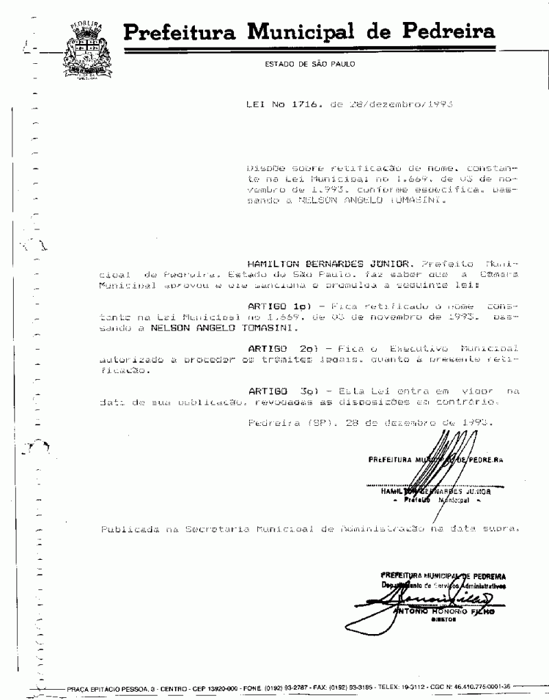 Lei Municipal - N° 1716 de 28/12/1993