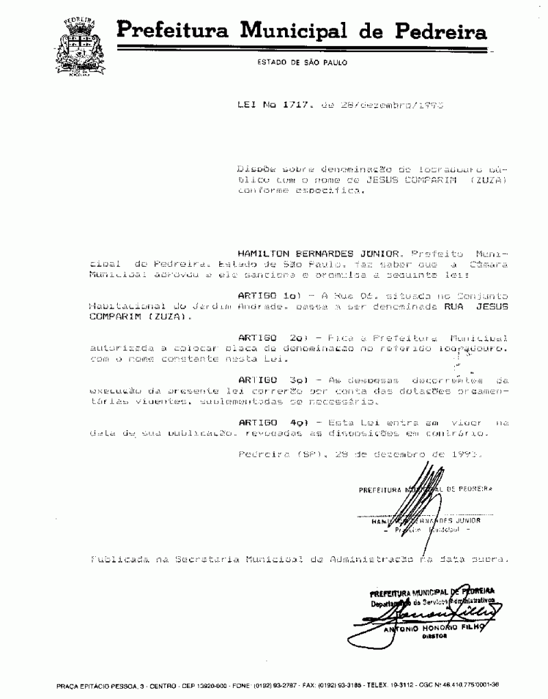 Ementa: Dispõe sobre denominação de logradouro público com o nome de Jesus Comparim (Zuza) conforme especifica.