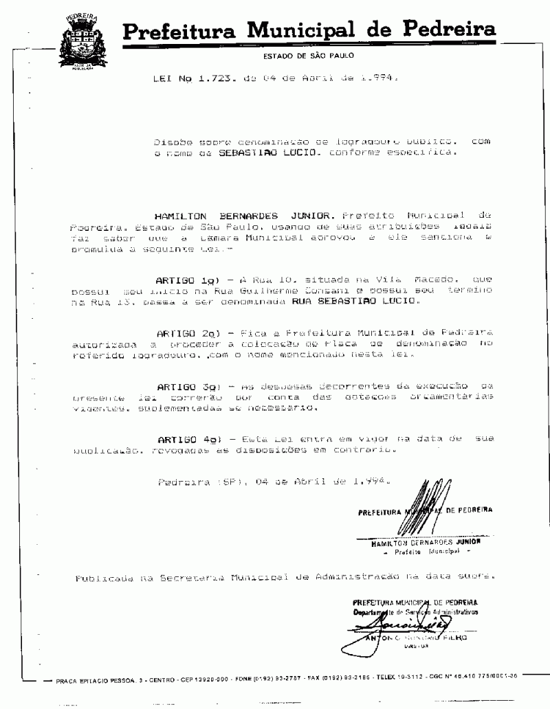 Lei Municipal - N° 1723 de 04/04/1994