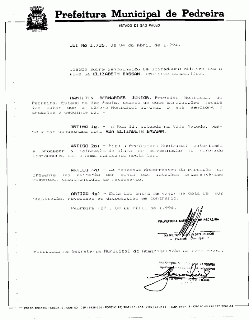 Lei Municipal - N° 1726 de 04/04/1994