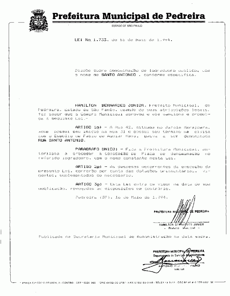 Ementa: Dispõe sobre denominação de logradouro público, com o nome de Santo Antonio, conforme especifica.