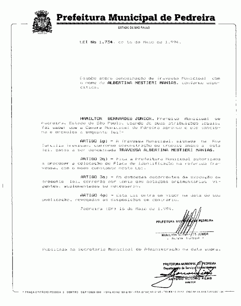 Lei Municipal - N° 1734 de 16/05/1994