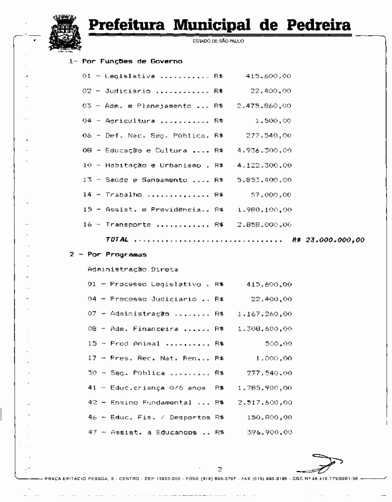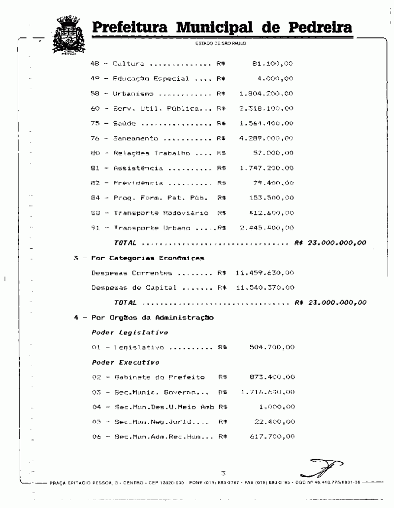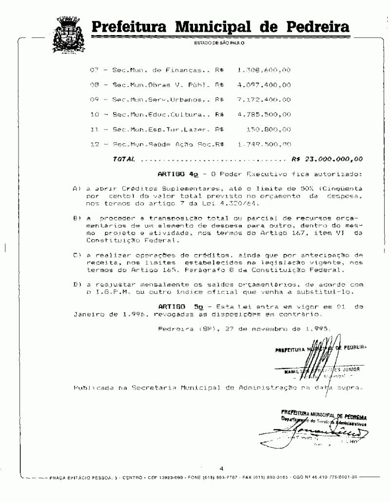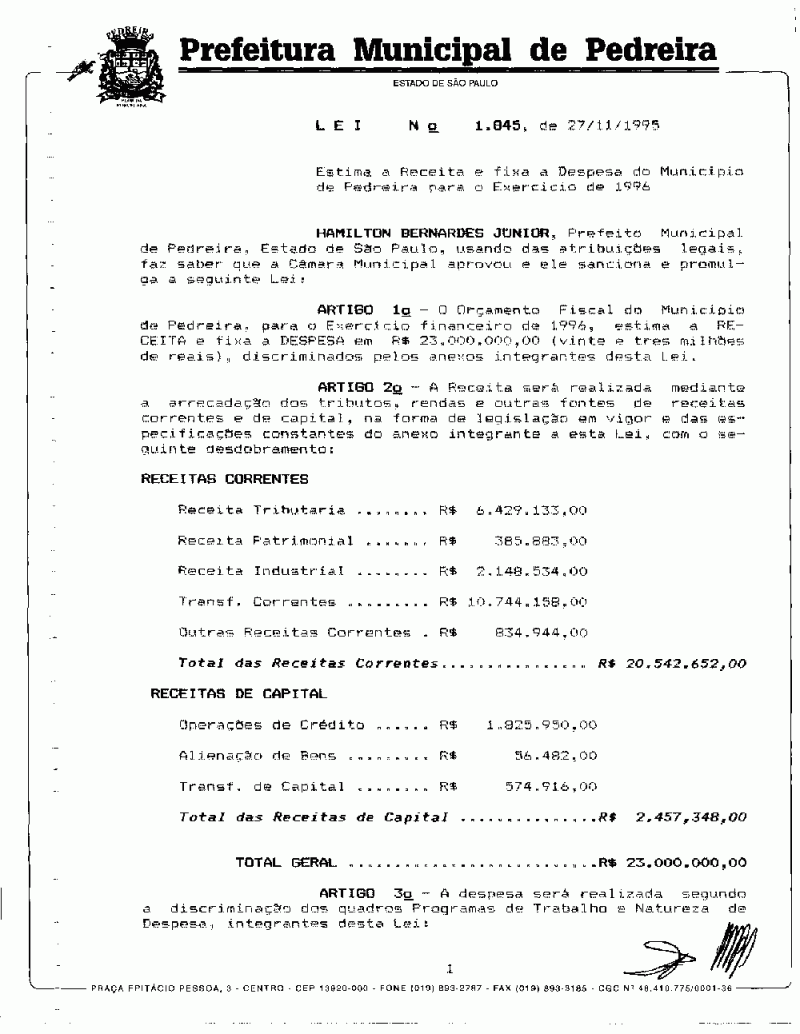 Ementa: Estima a Receita e fixa a Despesa do Município de Pedreira para o exercício de 1996.