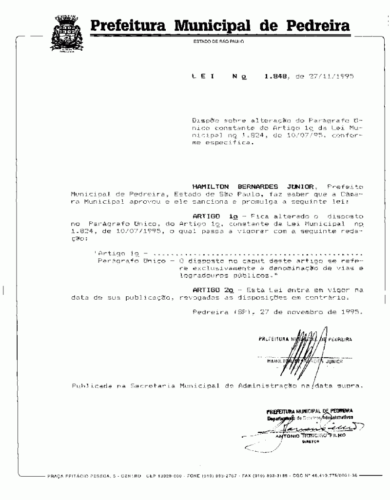 Ementa: Dispõe sobre alteração do parágrafo único constante do artigo 1º da Lei Municipal nº 1824, de 10/07/95, conforme especifica.