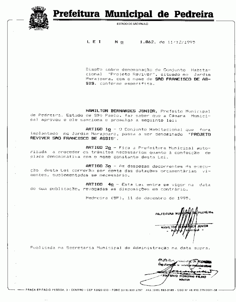 Ementa: Dispõe sobre denominação de Conjunto Habitacional "Projeto Reviver", situado no Jardim Marajoara, com o nome de São Francisco de Assis, conforme especifica.