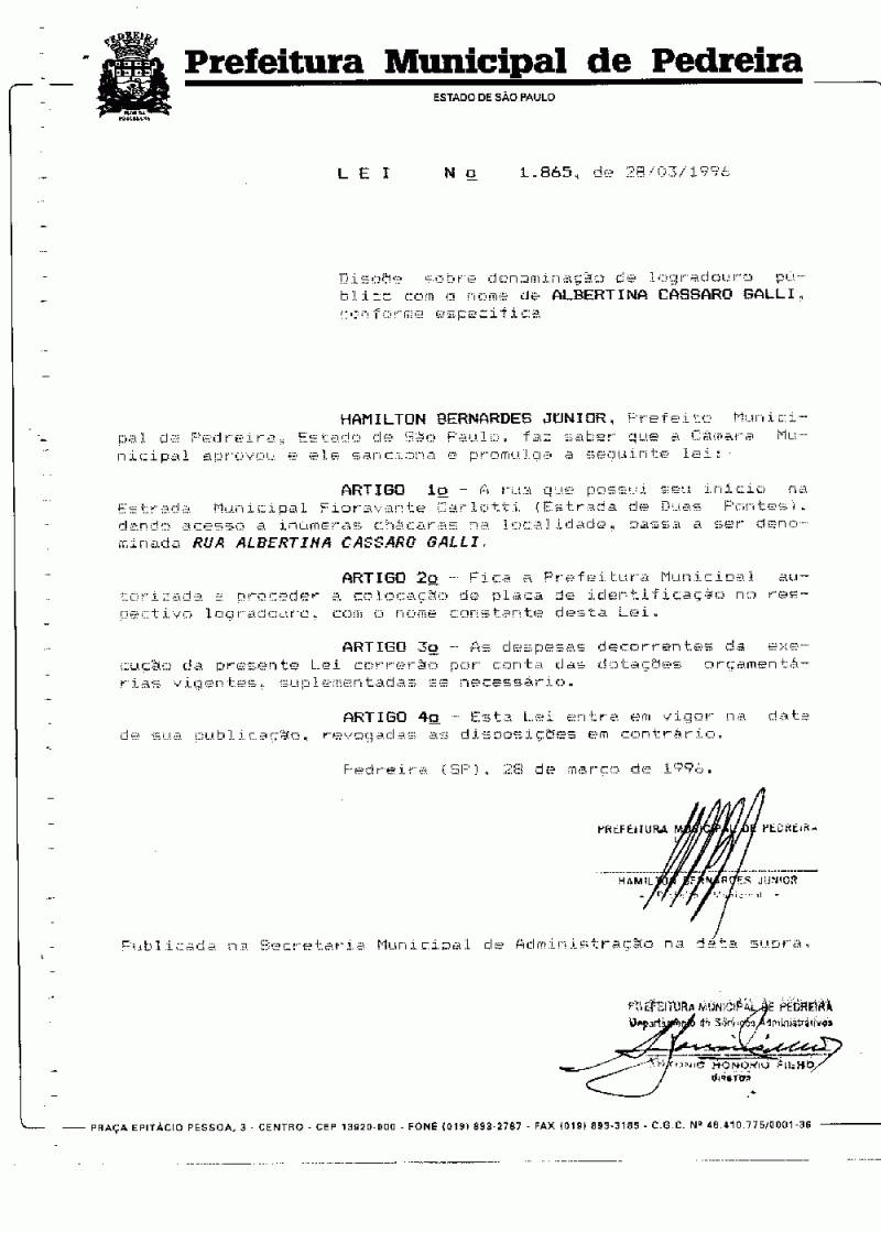 Ementa: Dispõe sobre denominação de logradouro público com o nome de Albertina Cassaro Galli, conforme especifica.