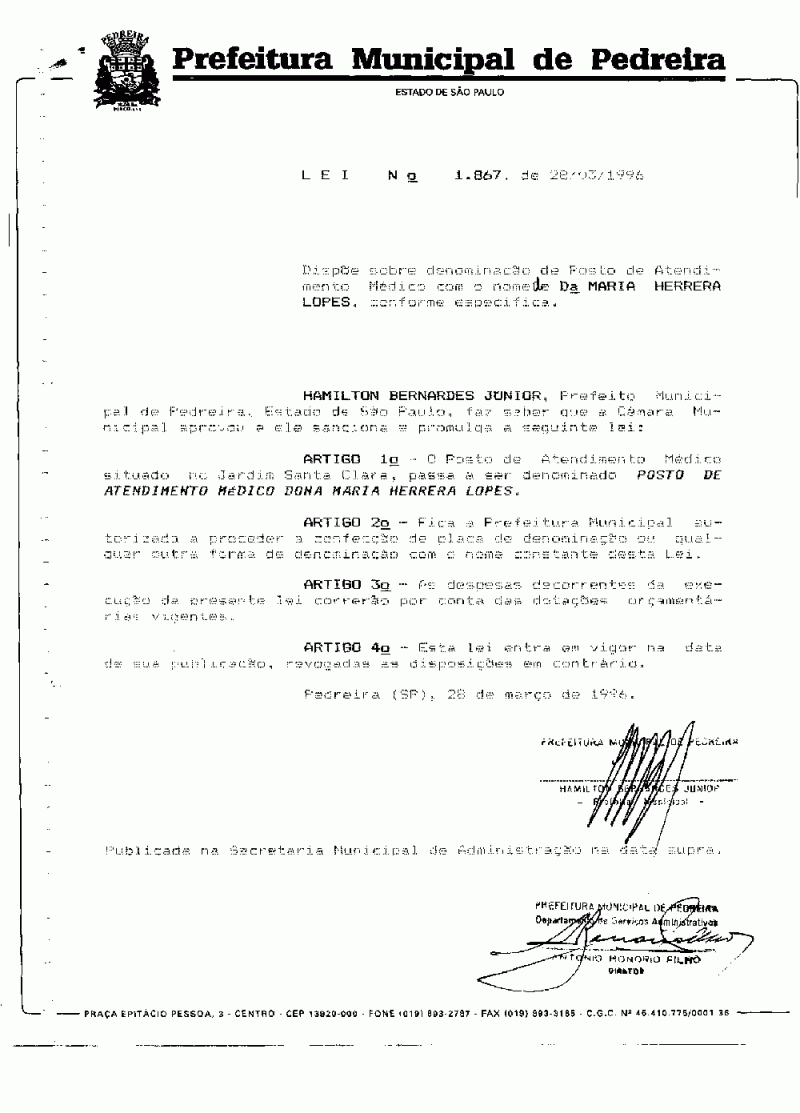 Ementa: Dispõe sobre denominação de Posto de Atendimento Médico com o nome de Dª Maria Herrera Lopes, conforme especifica.