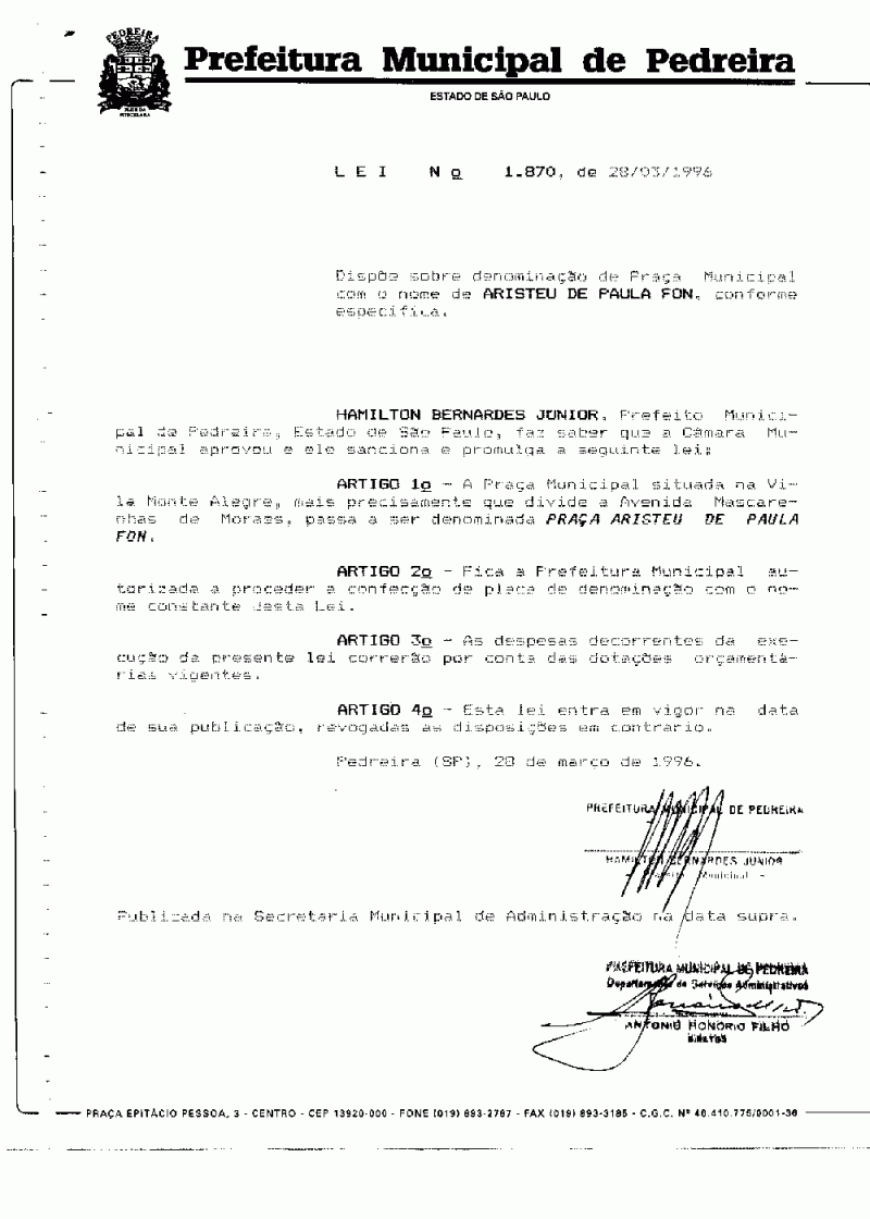 Ementa: Dispõe sobre denominação de Praça Municipal com o nome de Aristeu de Paula Fon, conforme especifica.