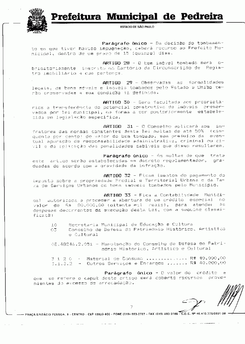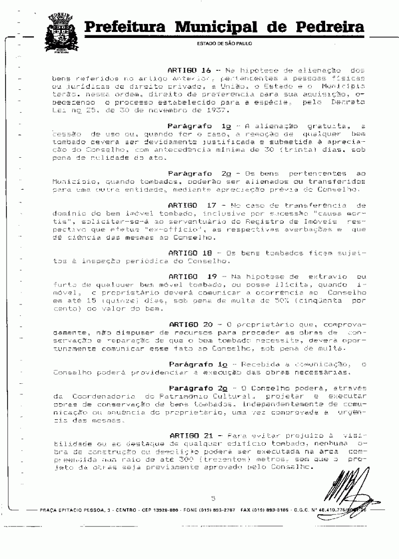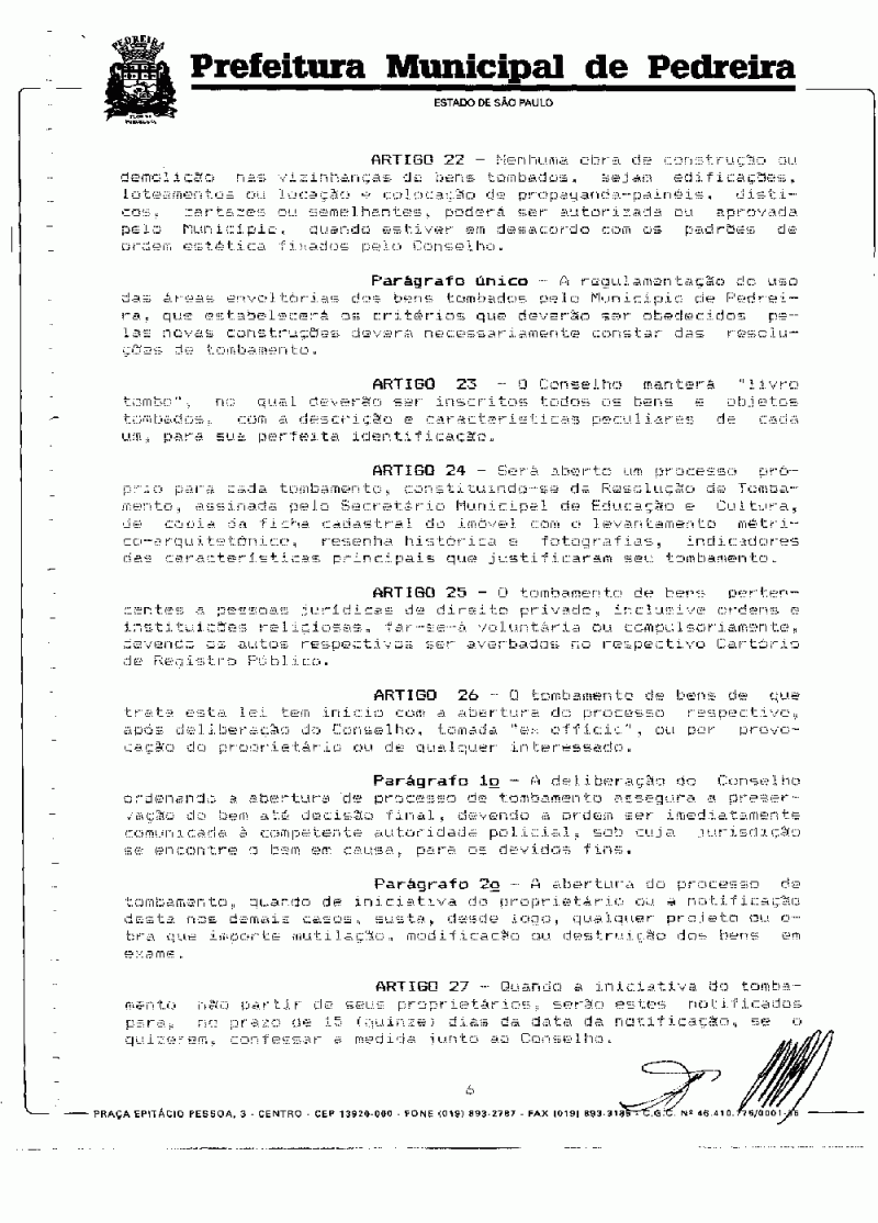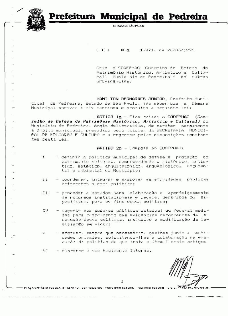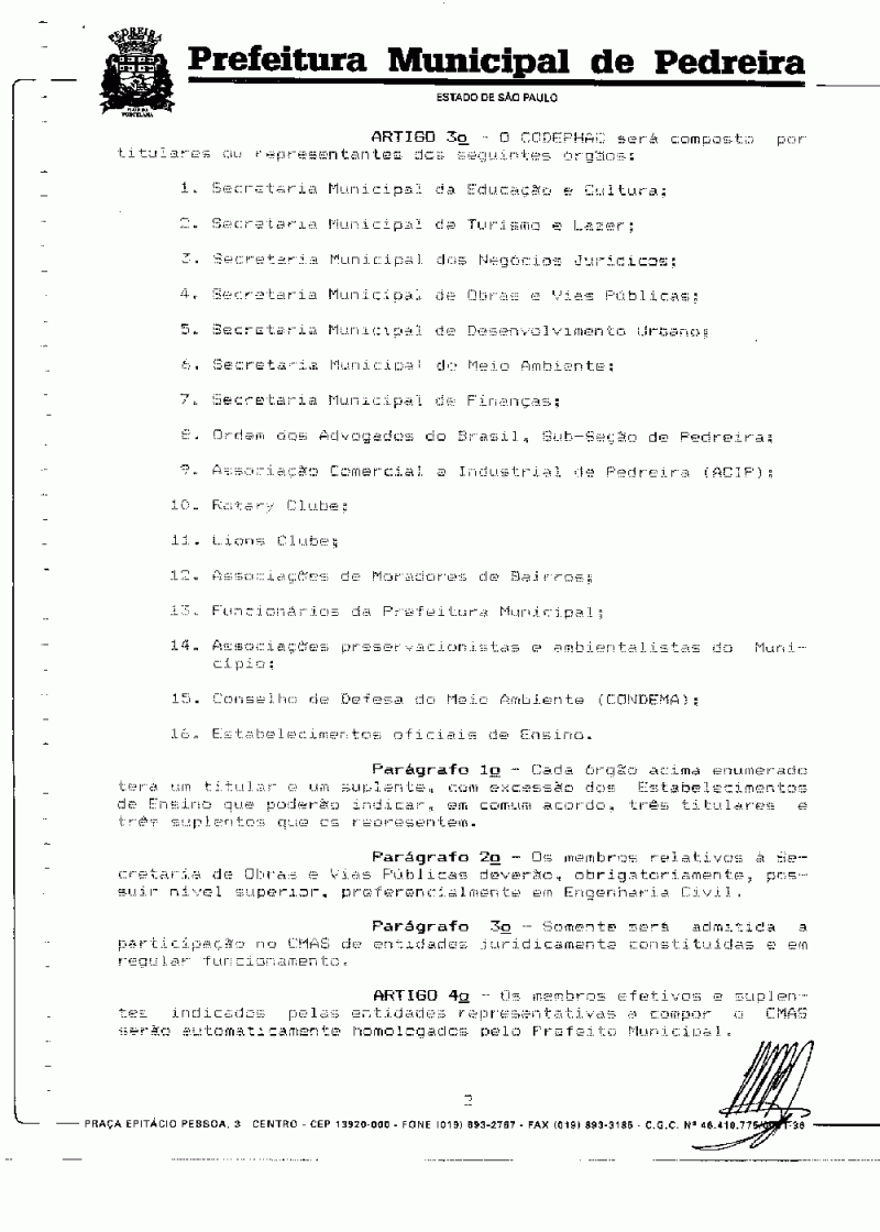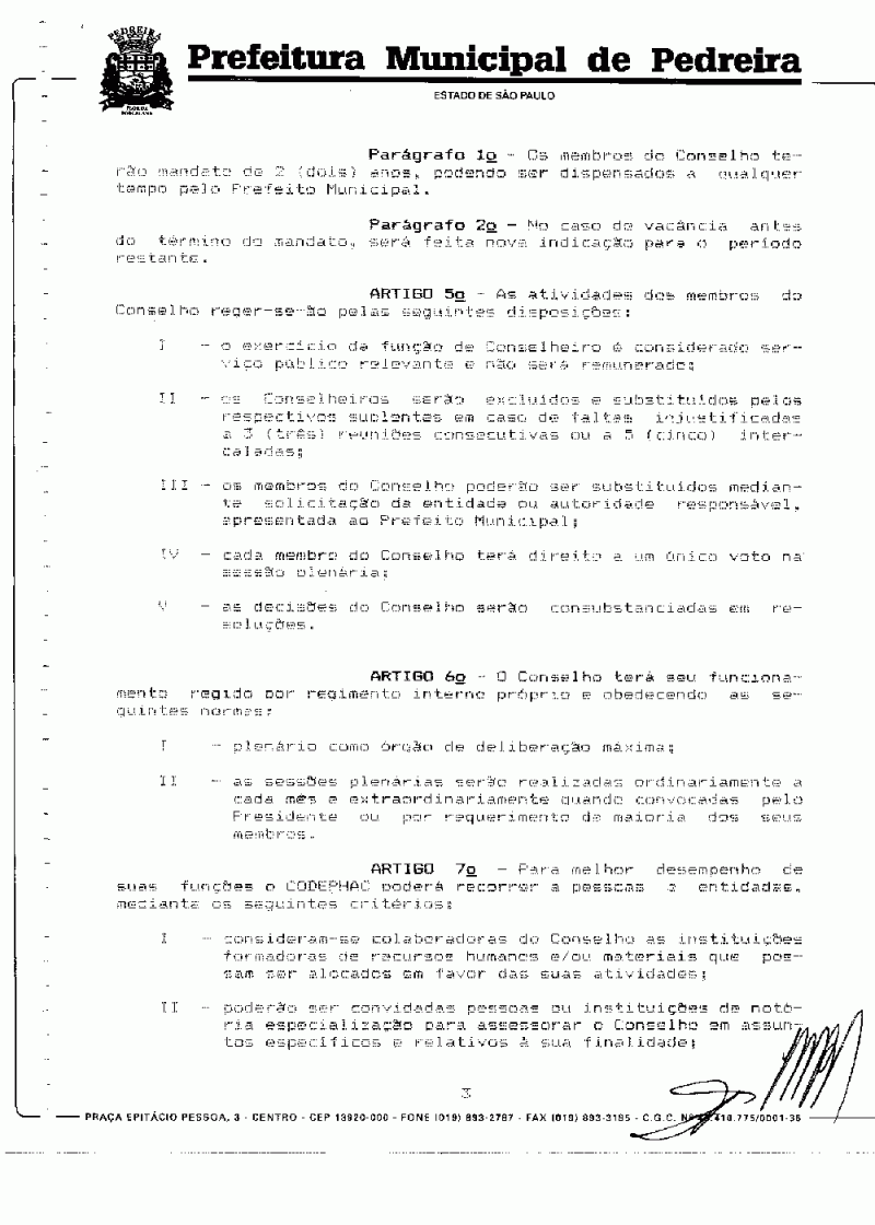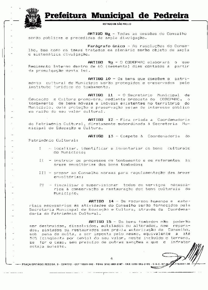 Ementa: Cria o CODEPHAC (Conselho de Defesa do Patrimônio Histórico, Artístico e Cultural) Municipal de Pedreira e dá outras providências.