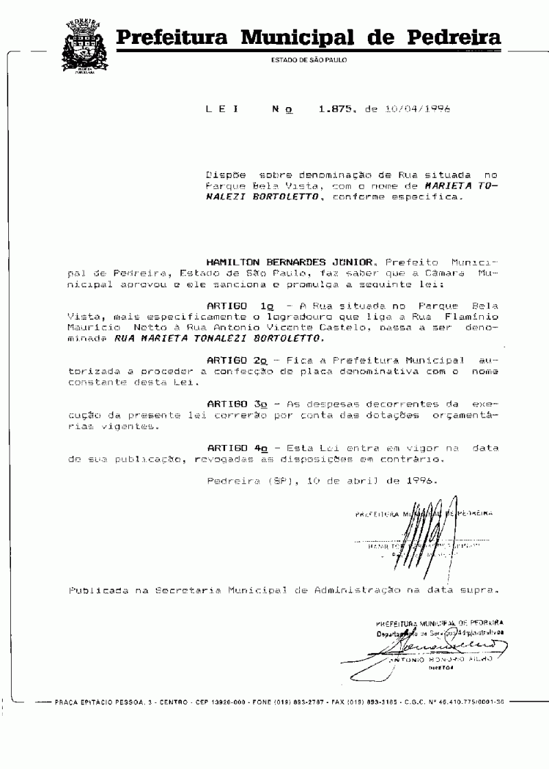 Lei Municipal - N° 1875 de 10/04/1996