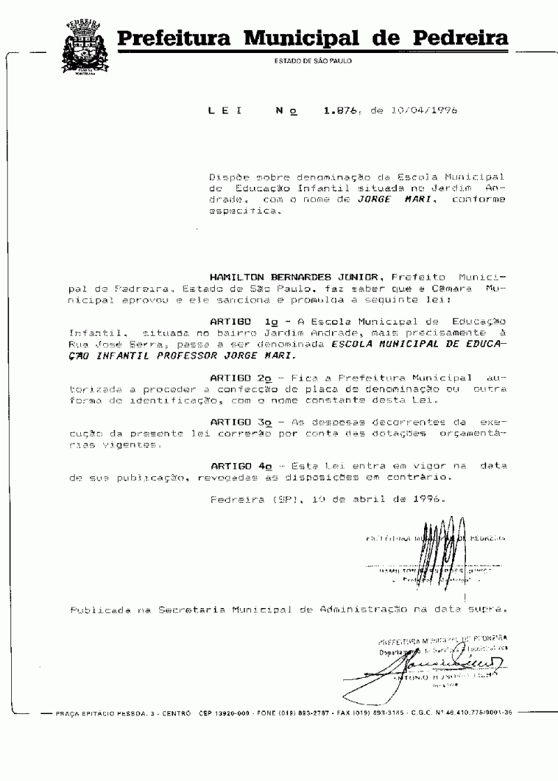 Lei Municipal - N° 1876 de 10/04/1996
