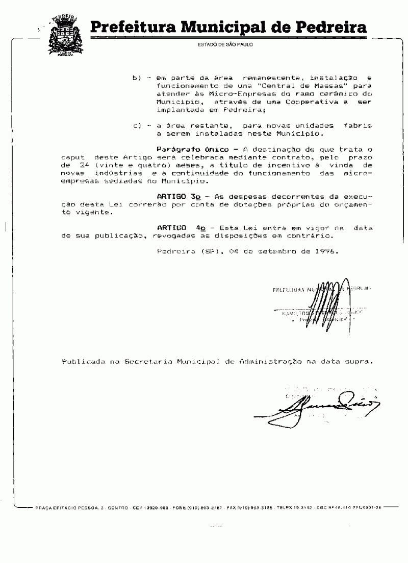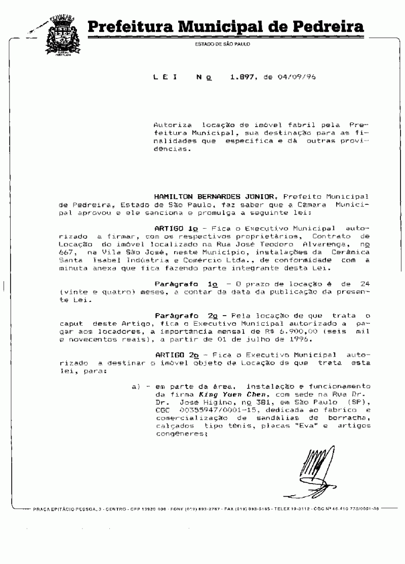 Ementa: Autoriza locação de imóvel fabril pela Prefeitura Municipal, sua destinação para as finalidades que especifica e dá outras providências.