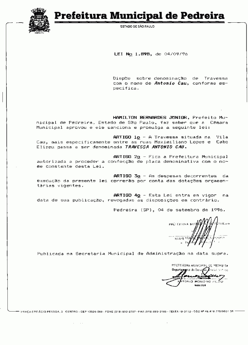 Lei Municipal - N° 1898 de 04/09/1996