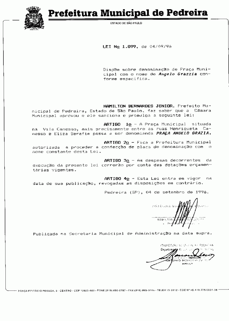 Ementa: Dispõe sobre denominação de Praça Municipal com o nome de Angelo Grazzia conforme especifica.