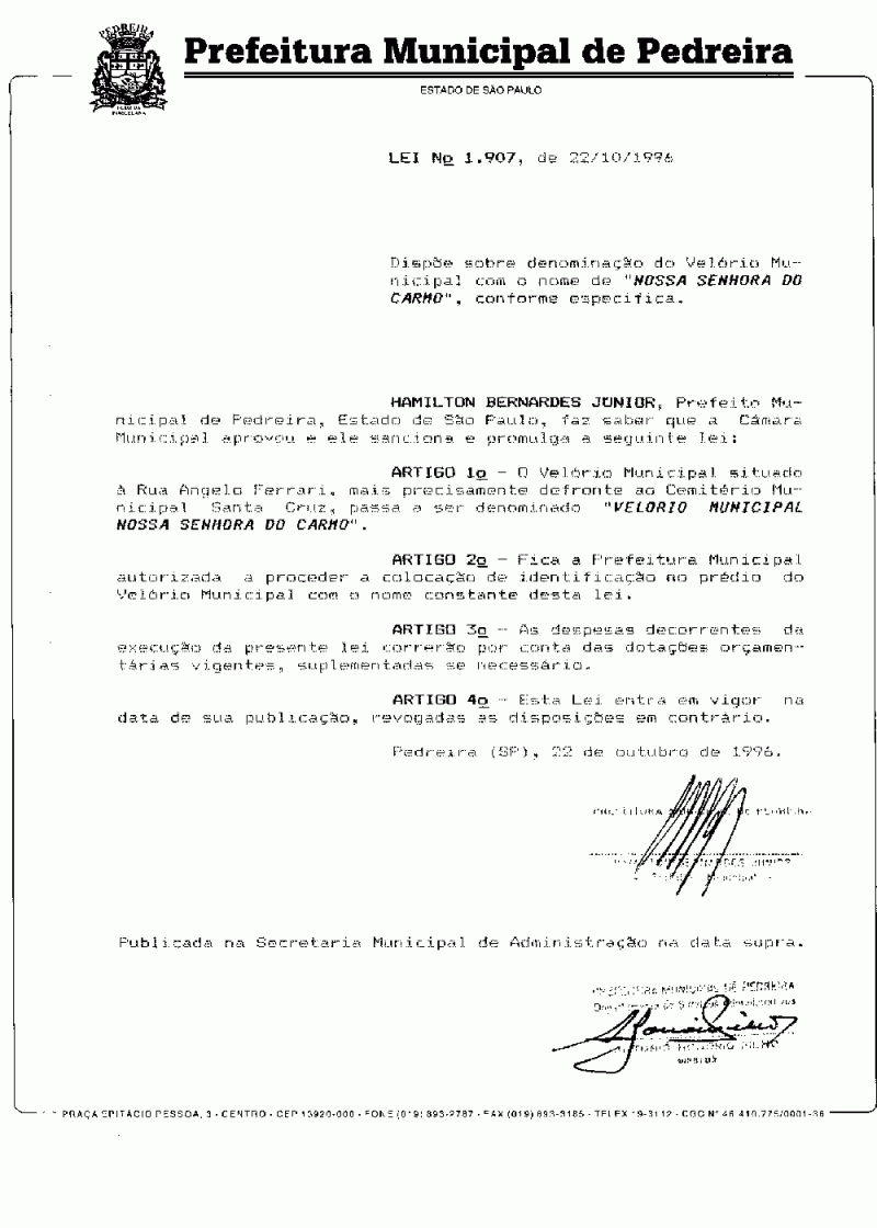 Lei Municipal - N° 1907 de 22/10/1996
