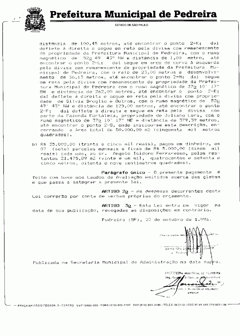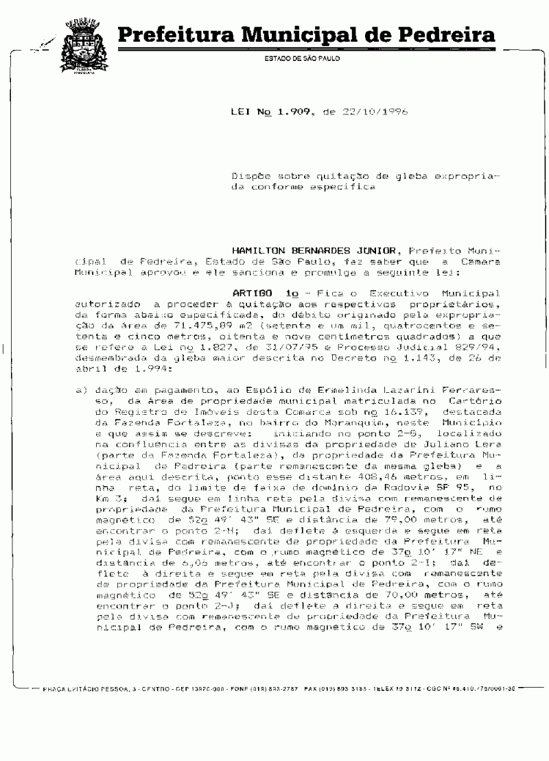 Lei Municipal - N° 1909 de 22/10/1996