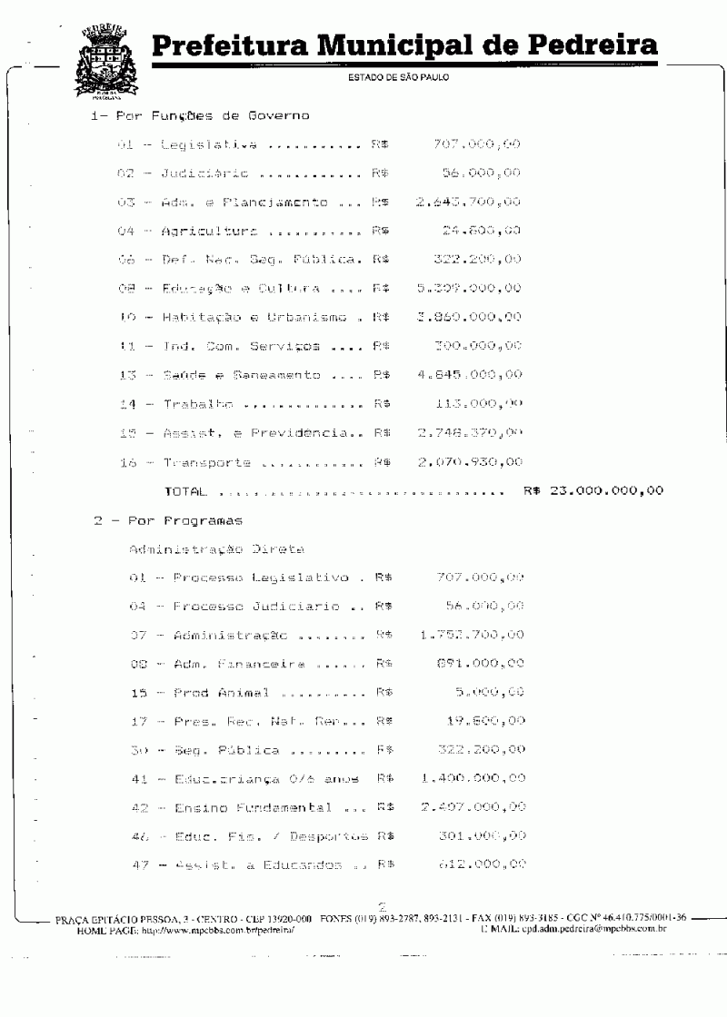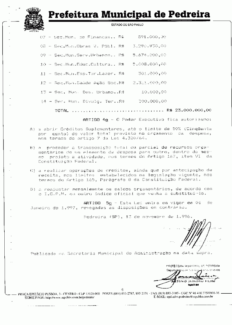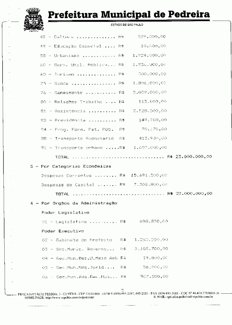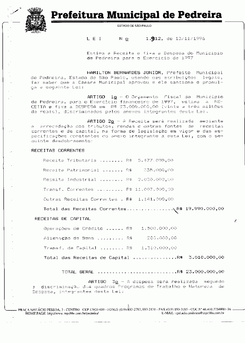 Ementa: Estima a Receita e fixa a Despesa do Município de Pedreira para o exercício de 1997.