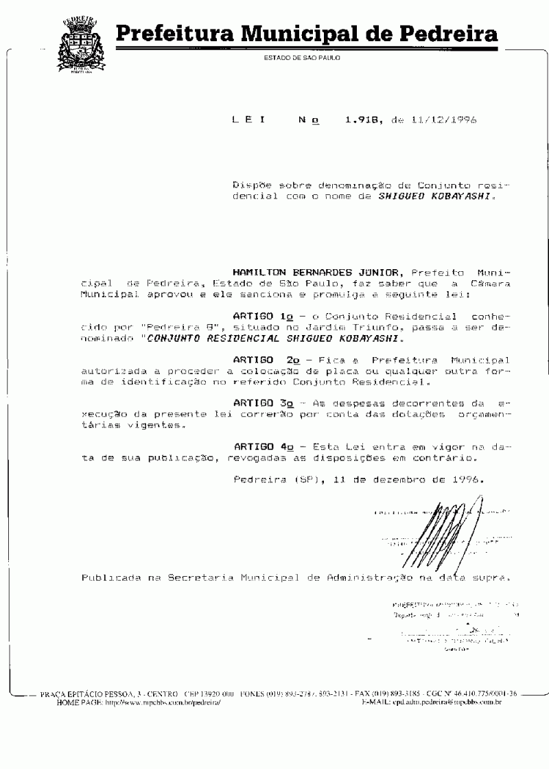 Ementa: Dispõe sobre denominação de Conjunto Residencial com o nome de Shigueo Kobayashi.