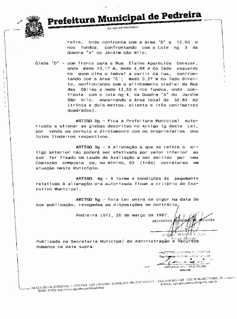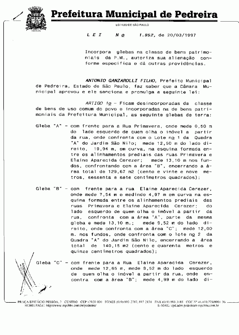 Ementa: Incorpora glebas na classe de bens patrimoniais da P.M., autoriza sua alienação conforme especifica e dá outras providências.