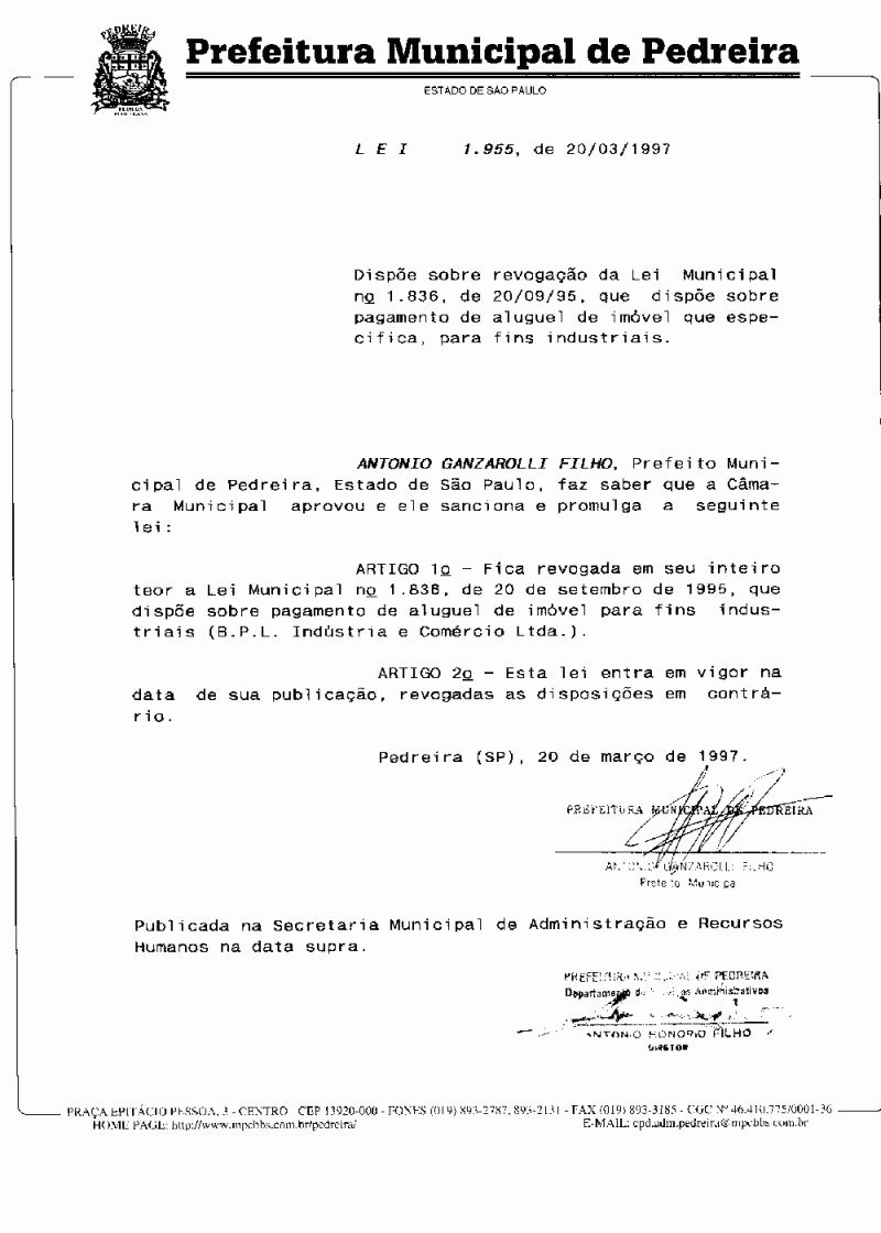 Ementa: Dispõe sobre revogação da Lei municipal nº 1836, de 20/05/95, que dispõe sobre pagamento de aluguel de imóvel que especifica, para fins industriais.