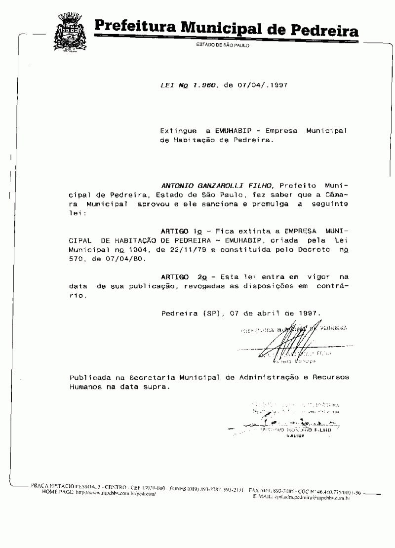 Ementa: Extingue a EMUHABIP - Empresa Municipal de Habitação de Pedreira.