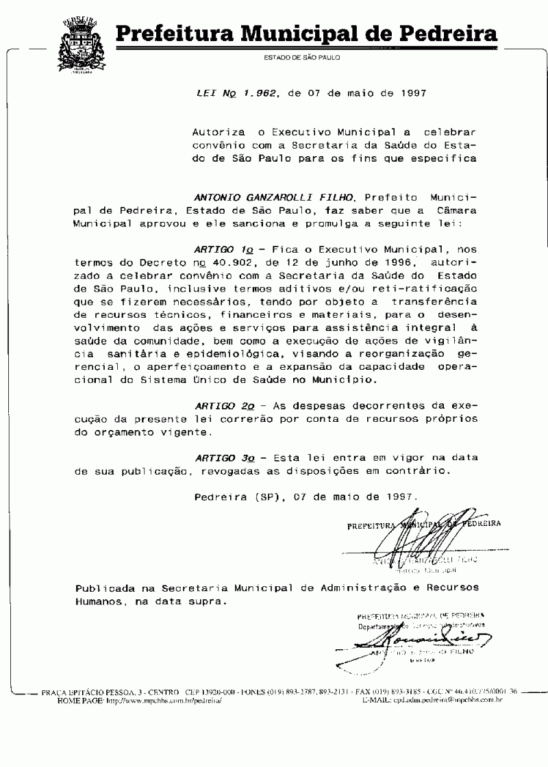 Lei Municipal - N° 1962 de 07/05/1997