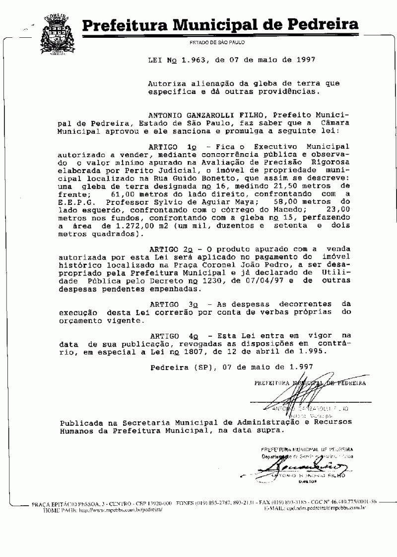 Lei Municipal - N° 1963 de 07/05/1997