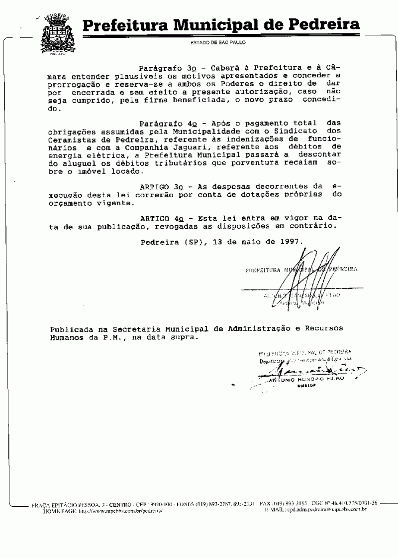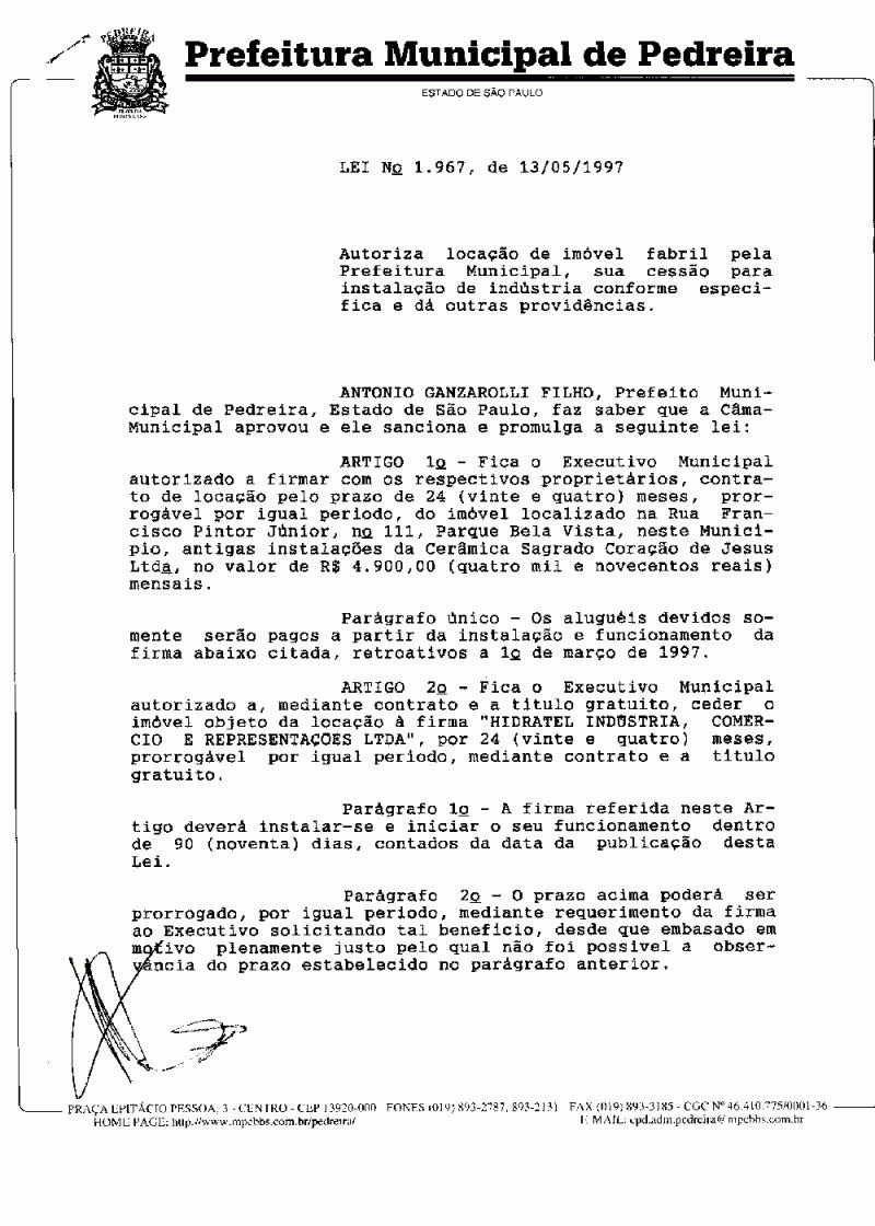Ementa: Autoriza locação de imóvel fabril pela Prefeitura Municipal, sua cessão para instalação de indústria conforme especifica e dá outras providências.