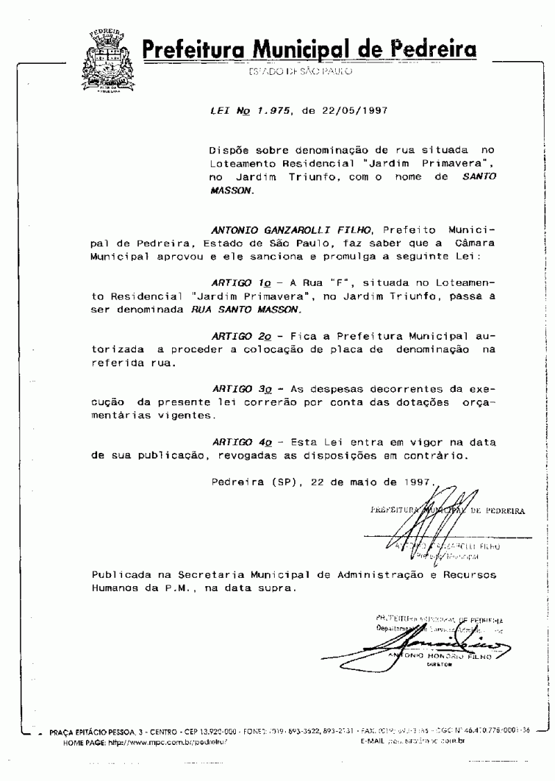Ementa: Dispõe sobre denominação de rua situada no Loteamento Residencial "Jardim Primavera", no Jardim Triunfo, com o nome de Santo Masson.