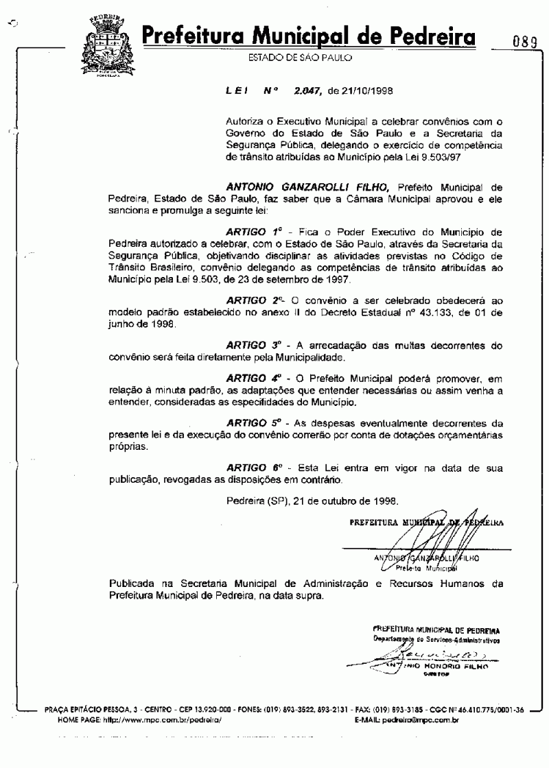 Ementa: Autoriza o Executivo Municipal a celebrar convênios com o Governo do Estado de São Paulo e a Secretaria da Segurança Pública, delegando o exercício de competência de trânsito atribuídas ao Município pela Lei 9503/97.