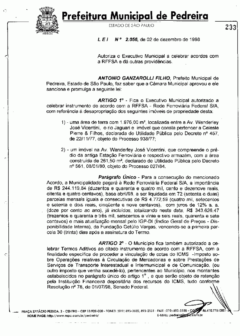 Ementa: Autoriza o Executivo Municipal a celebrar acordos com a RFFSA e dá outras providências.