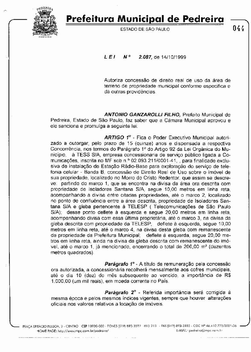 Ementa: Autoriza concessão de direito real de uso da área de terreno de propriedade municipal conforme especifica e dá outras providências.