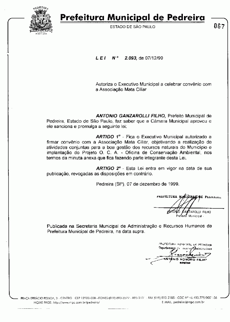 Lei Municipal - N° 2093 de 07/12/1999