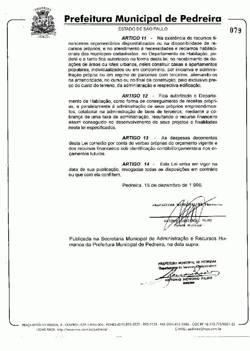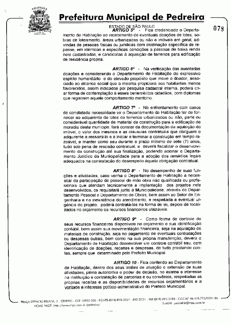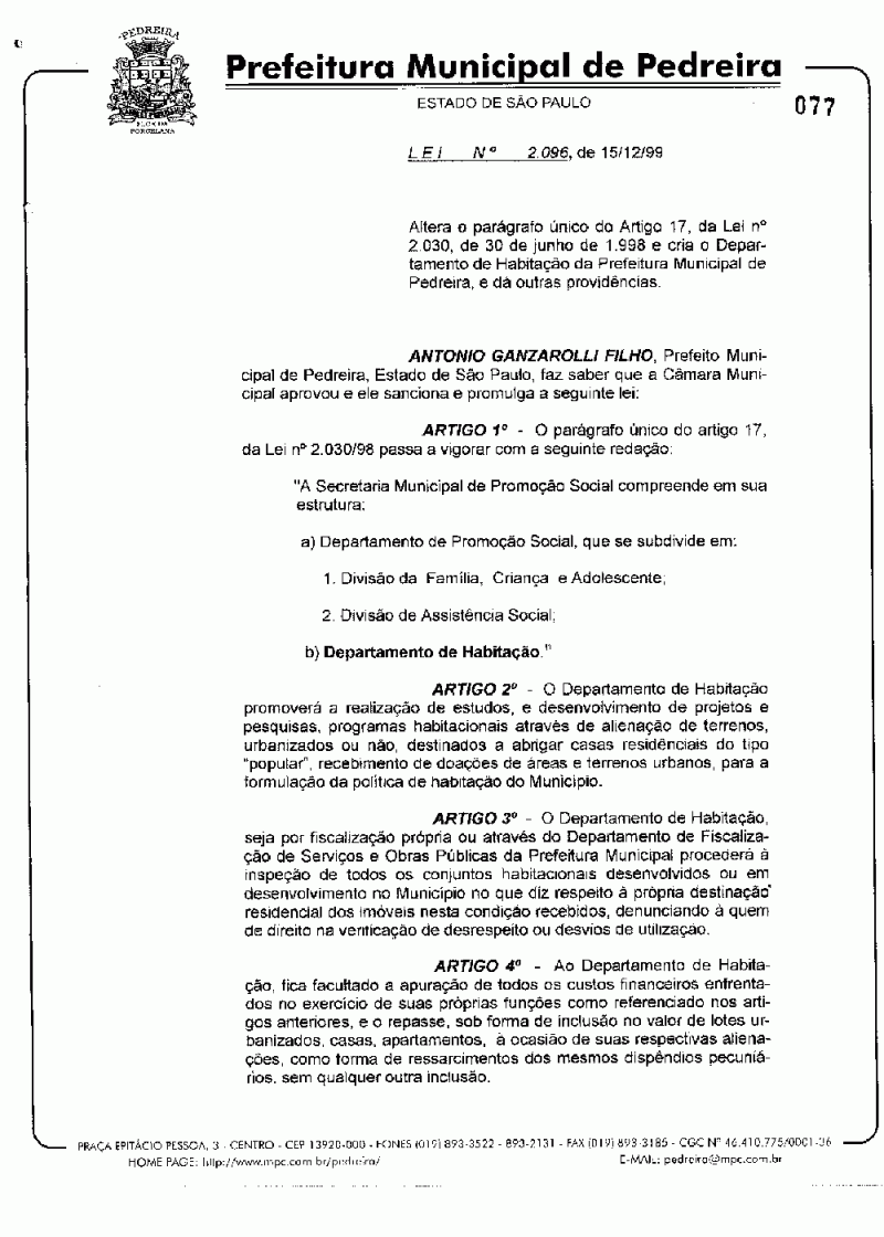 Ementa: Altera o parágrafo único do Artigo 17, da Lei nº 2030, de 30 de junho de 1998 e cria o Departamento de Habitação da Prefeitura Municipal de Pedreira, e dá outras providências.
