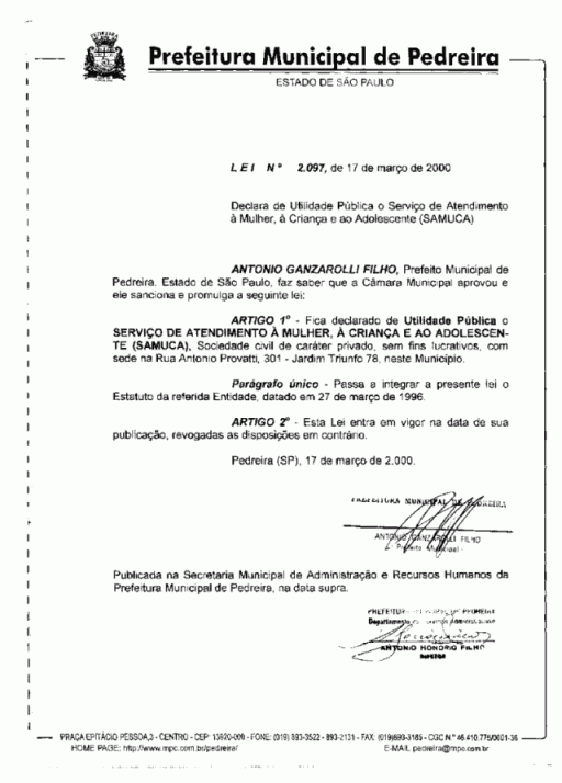 Ementa: Declara de utilidade pública o Serviço de Atendimento à Mulher, à Criança e ao Adolescente (SAMUCA).