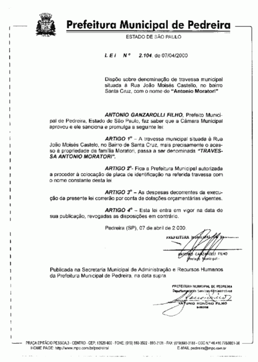 Lei Municipal - N° 2104 de 07/04/2000