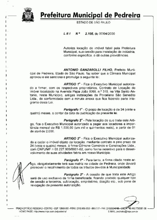 Ementa: Autoriza locação de imóvel fabril pela Prefeitura Municipal, sua cessão para instalação de indústria, conforme especifica, e dá outras providências.