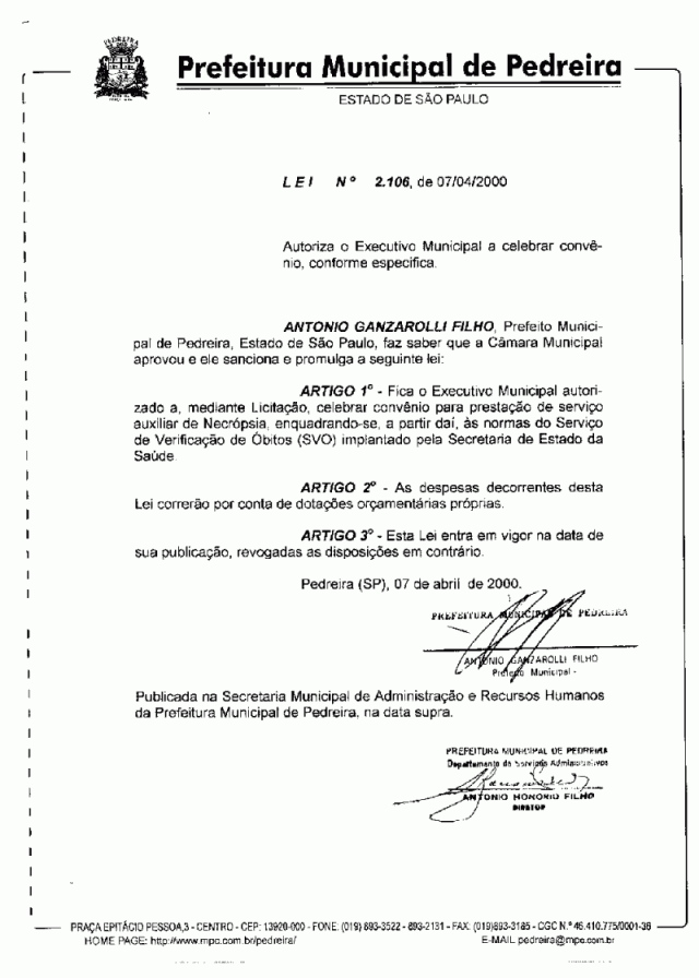 Lei Municipal - N° 2106 de 07/04/2000