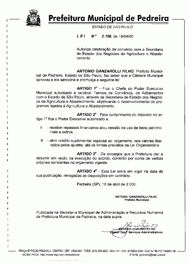 Lei Municipal - N° 2108 de 18/04/2000