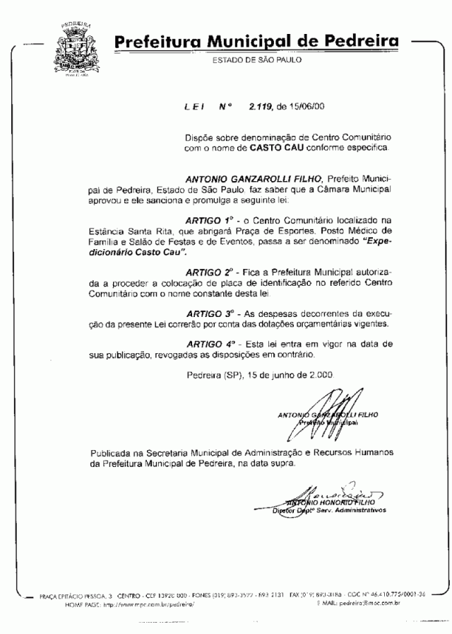 Ementa: Dispõe sobre denominação de Centro Comunitário com o nome de Casto Cau conforme especifica.