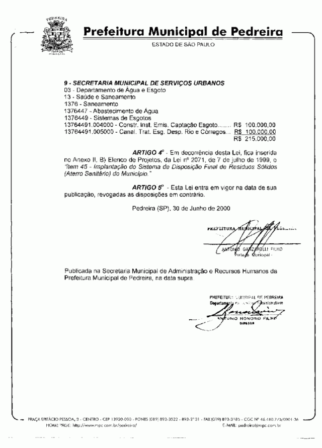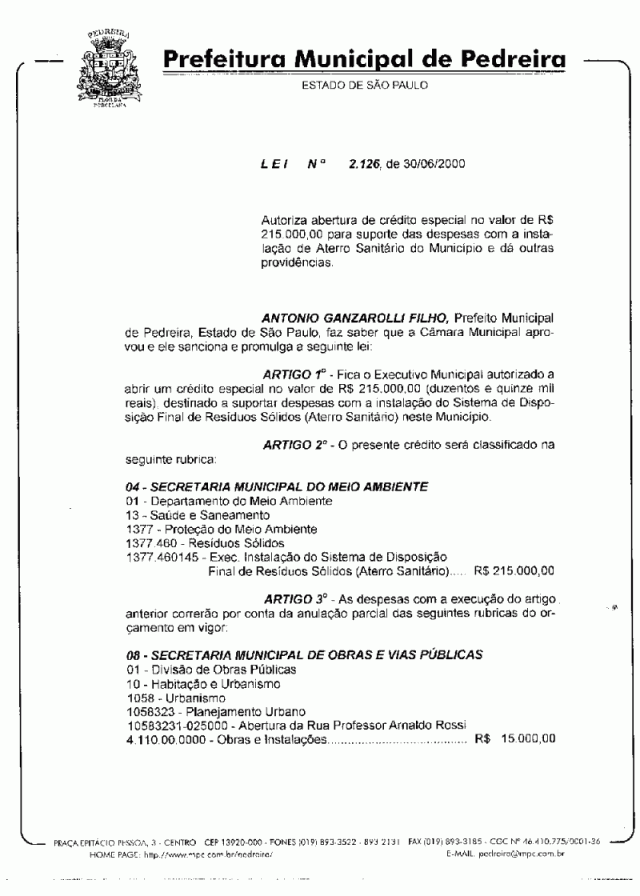 Lei Municipal - N° 2126 de 30/06/2000
