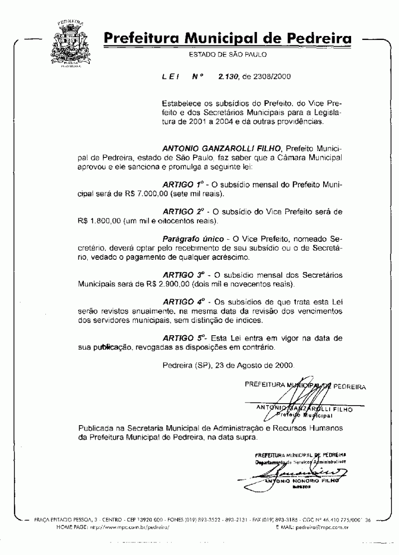 Ementa: Estabelece os subsídios do Prefeito, do Vice Prefeito e dos Secretários Municipais para a Legislatura de 2001 a 2004 e dá outras providências.